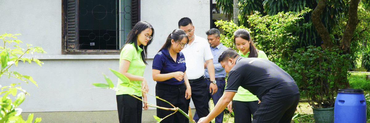 Các tình nguyện viên và đại diện đơn vị đồng hành cùng nhau trồng tre, tạo mảng xanh gắn kết cộng đồng tại Làng SOS Gò Vấp.