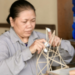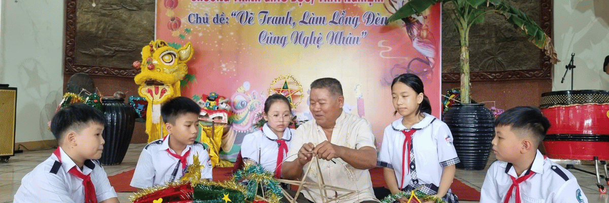 Các em nhỏ thích thú khi được xem và cùng nghệ nhân làm lồng đèn Trung thu truyền thống với nguyên liệu từ những thanh tre tại Bảo tàng Tổng hợp tỉnh Quảng Ngãi.