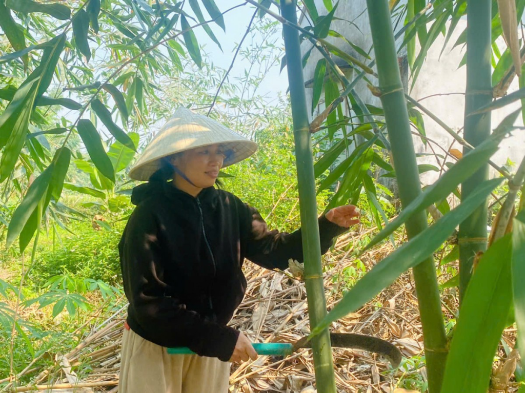 Chị Diệu thăm và chăm sóc vườn, đồng thời chia sẻ quá trình trồng và chăm bón cây tre trong điều kiện tự nhiên.