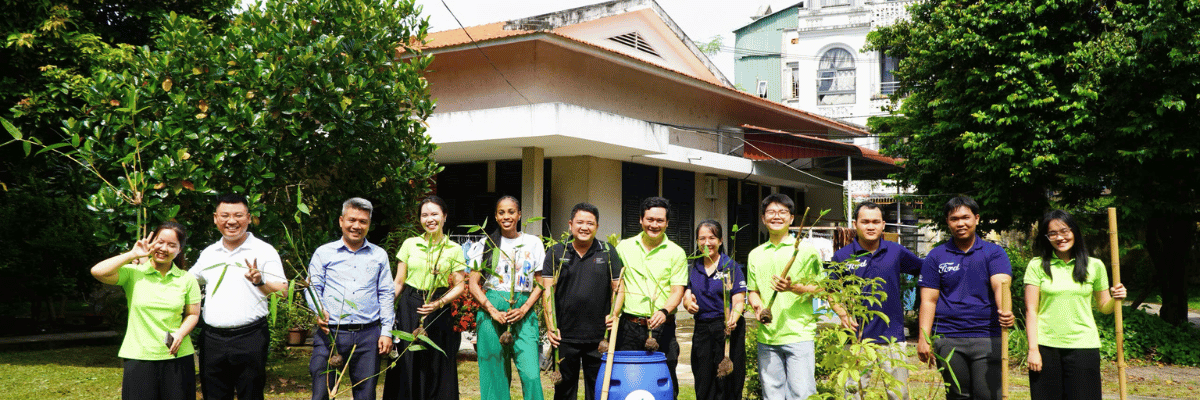 Các tình nguyện viên và đại diện đơn vị đồng hành cùng nhau trồng tre, tạo mảng xanh gắn kết cộng đồng tại Làng SOS Gò Vấp.